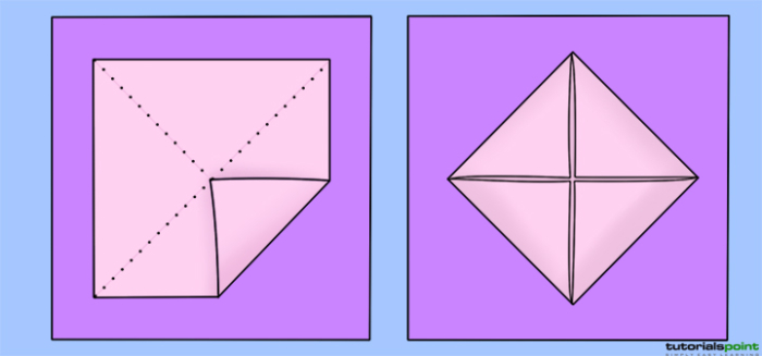 下一步是將信封的翻蓋摺疊到位。將菱形的每個角摺疊到中心,使形狀像菱形。檢查摺疊是否正確。
