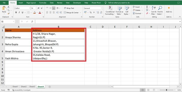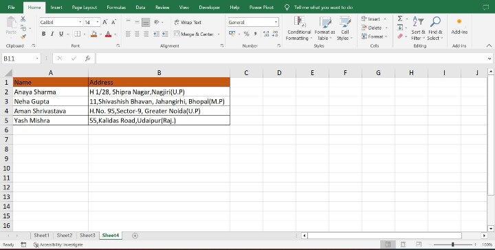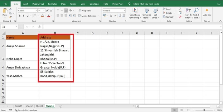 假設工作表包含以下資料。該工作表包含兩列,名為“姓名”和“地址”,其中填充了各種使用者的姓名和地址,以演示如何在單元格中強制換行,如下所示