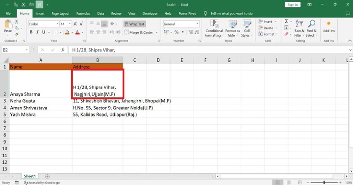 現在按組合鍵 Alt + Enter。現在立即新增換行符,如下面的影像中突出顯示的那樣。然後按 Enter 鍵,結果將顯示在單元格 B2 中。