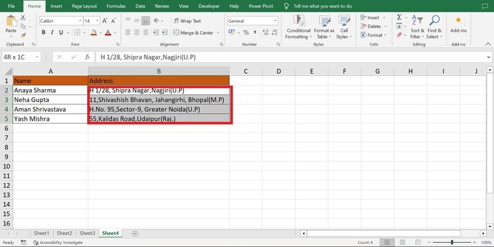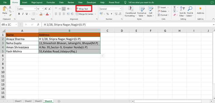 選擇單元格 B2:B5,在其中想要換行或在單元格中自動換行,如下面的影像中突出顯示的那樣。