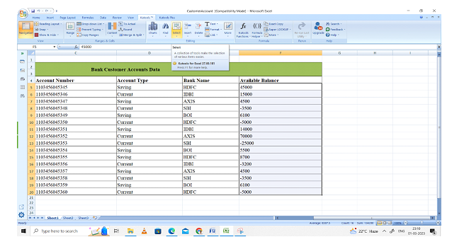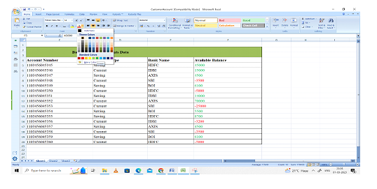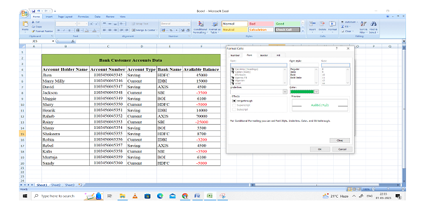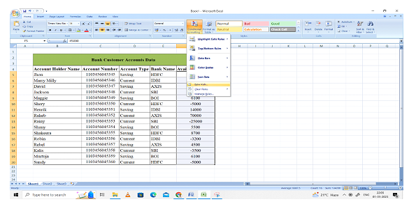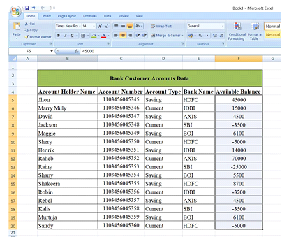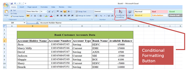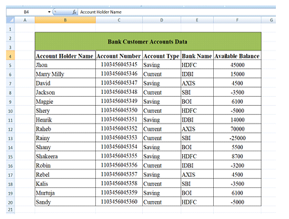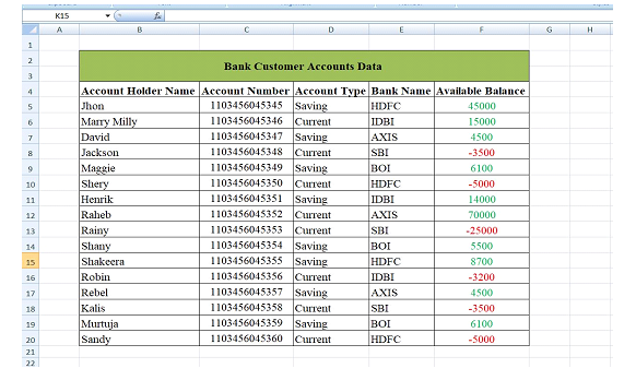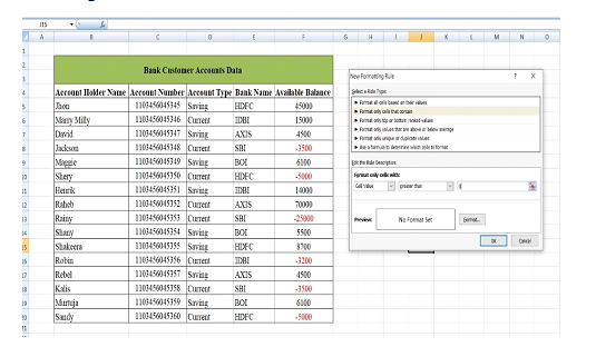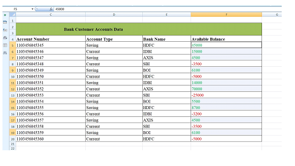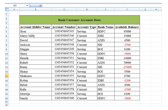 藉助 Excel 的條件格式化功能,我們可以根據給定的約束條件格式化單元格值的顏色。為了演示這種方法,我們考慮了銀行客戶賬戶的樣本資料,其中包含客戶姓名、賬戶號碼、賬戶型別、銀行名稱、可用餘額等欄位。這裡,客戶的賬戶餘額可能是零、正數或負數。因此,為了篩選出餘額為負數的客戶(透過將相應的單元格格式化為紅色),以及餘額為非負數且大於零的客戶(透過將單元格格式化為綠色),我們採用了條件格式化方法。客戶資料顯示在下面的表格中。