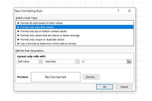 在“新建規則”視窗中選擇“僅格式化包含以下內容的單元格”選項,然後在“僅使用以下格式格式化單元格”視窗中選擇“單元格值,小於 0”選項,如下圖所示。