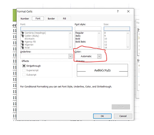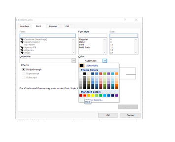 單擊“單元格格式”對話方塊的“字型”選項卡,然後單擊“顏色”選項,如下所示