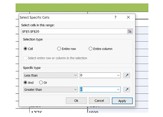 之後,將開啟“選擇特定單元格”視窗。在此視窗中,我們將單元格選項選擇為“選擇型別”,並選擇“小於”0 和“大於”0 作為“特定型別”選項。如下所示。