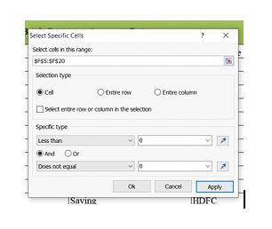 單擊“選擇特定單元格”視窗的“應用”按鈕。在此視窗中,我們將單元格選項選擇為“選擇型別”,並選擇“小於”0 和“不等於”0 作為“特定型別”選項,然後選擇值為負數的單元格,如下圖所示