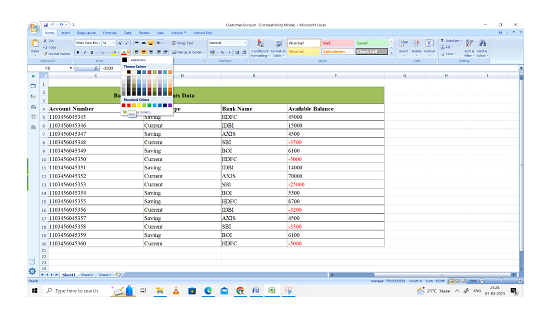轉到“開始”選項卡,然後單擊“字型顏色”選項。選擇紅色,然後所有選定單元格值的顏色將變為紅色,這些單元格值為負數,如下圖所示。