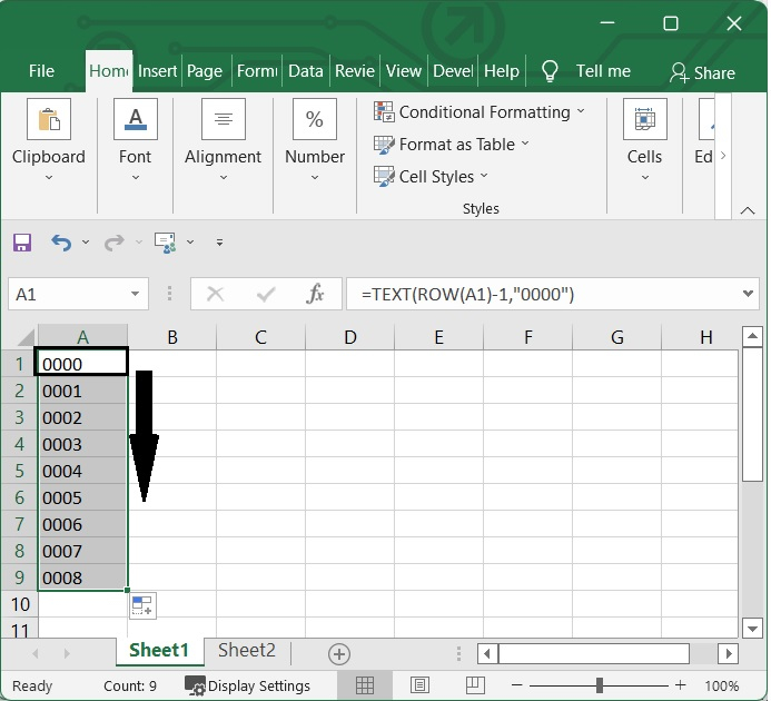 之後,將自動填充柄拖動到底部,直到列出所有可能的4位數組合。
