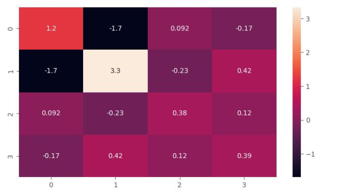 0 1 2 3 0 1.214261 -1.693503 0.092278 -0.167397 1 -1.693503 3.331807 -0.230052 0.424357 2 0.092278 -0.230052 0.381256 0.119570 3 -0.167397 0.424357 0.119570 0.387159