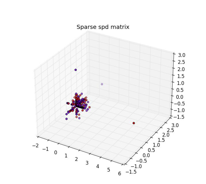 # Importing libraries from sklearn.datasets import make_sparse_spd_matrix import numpy as np import matplotlib.pyplot as plt import matplotlib.style import matplotlib as mpl mpl.style.use('classic') from mpl_toolkits.mplot3d import Axes3D # Creating Sparse spd matrix X= make_sparse_spd_matrix(dim=500, random_state=0) #Creating a random array 'y'(it's not sparse) from numpy import random y=random.randint(2, size=(500)) # Plotting the sparse spd matrix in 3-dimensional figure_3D = plt.figure(figsize=(7.50,3.50)) plt.subplots_adjust(bottom=0.05, top=0.9, left=0.05, right=0.95) ax = figure_3D.add_subplot(111, projection='3d') ax.scatter(X[:, 0], X[:, 1], X[:, 2], c=y, cmap=plt.cm.rainbow) plt.title('Sparse spd matrix') plt.show()