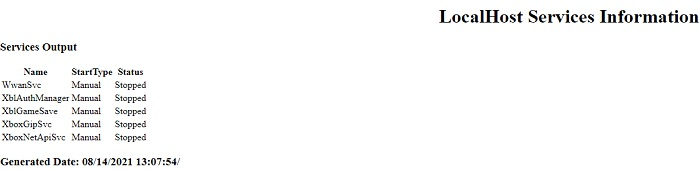 Get-Service | ConvertTo-Html -Property Name, StartType, Status | OutFile C:\Temp\services.html