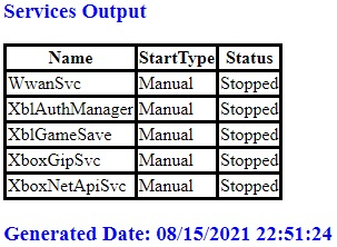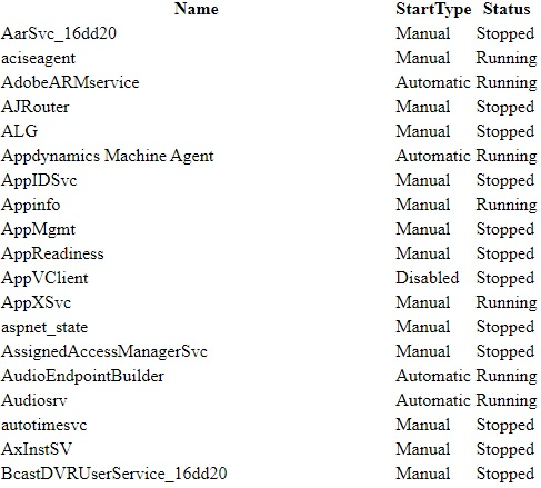 Get-Service | Select Name, StartType, Status | ConvertTo-Html | OutFile C:\Temp\services.html