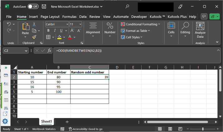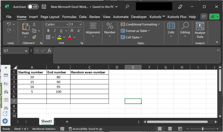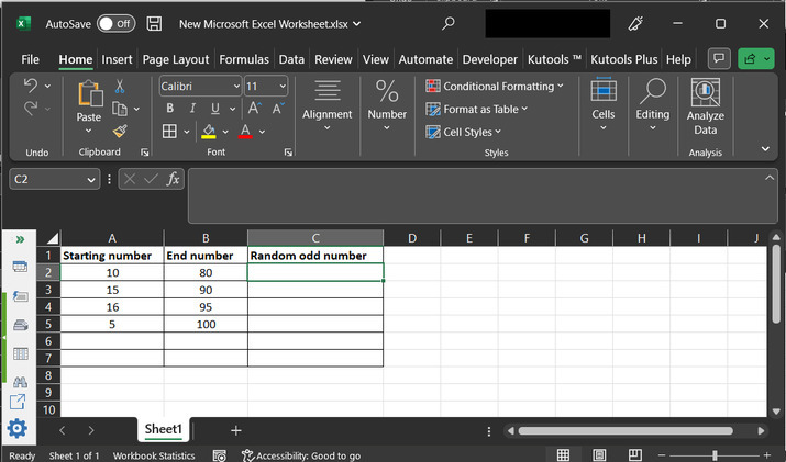 為了理解生成隨機數的過程,讓我們建立一個包含起始和結束數字的示例 Excel 表格。這兩個數字都可以用作範圍,新生成的隨機資料應該在這兩個數字之間,並且應該是奇數。