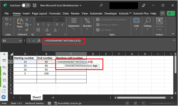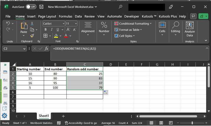 轉到 C2 單元格,輸入公式“=ODD(RANDBETWEEN(A2,B2))”。