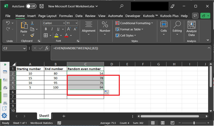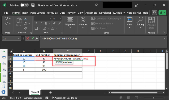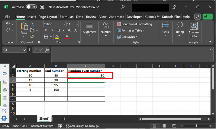 再次考慮同一個工作表,這次只需將 C 列標題資料從“奇數”更改為“偶數”。這兩個數字都可以用作範圍,新生成的隨機資料應該在這兩個數字之間,並且應該是偶數。