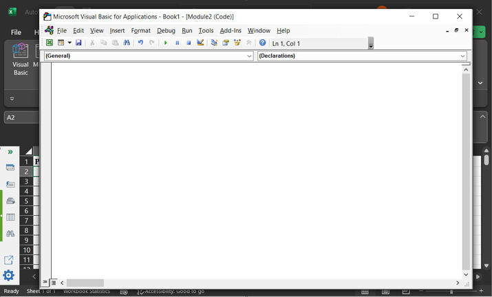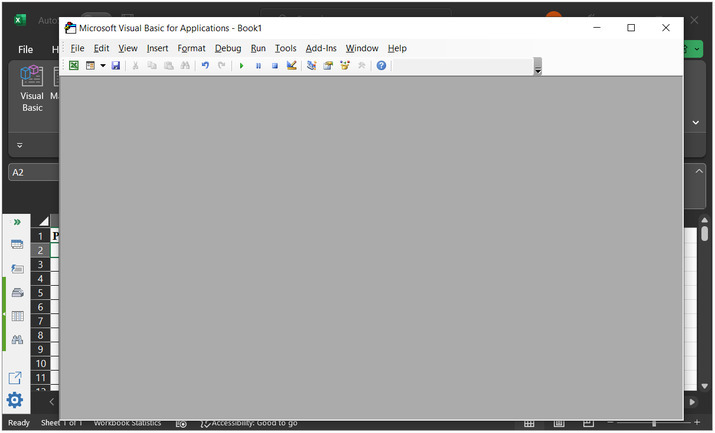新開啟的對話方塊是“Microsoft Visual Basic for Applications”。這將開啟以下程式碼視窗: