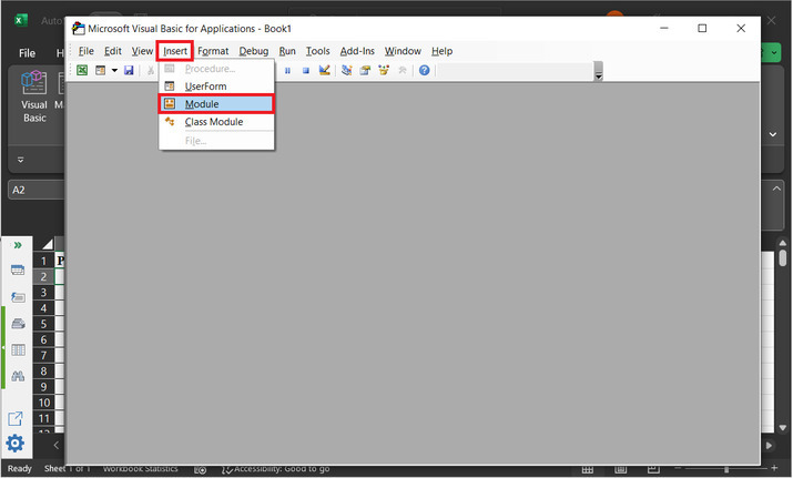 在對話方塊中,開啟“插入”選項,然後點選“模組”。請參考下圖以獲得參考