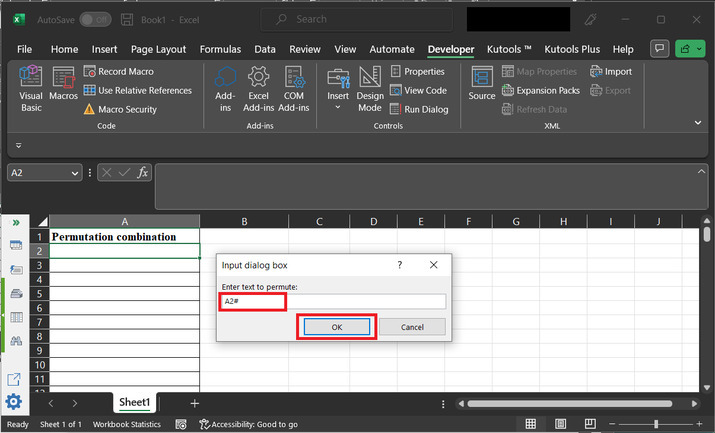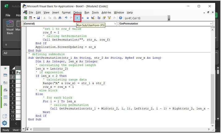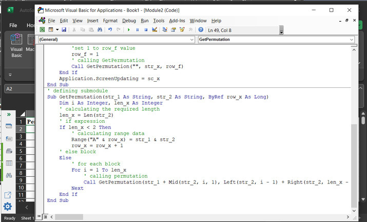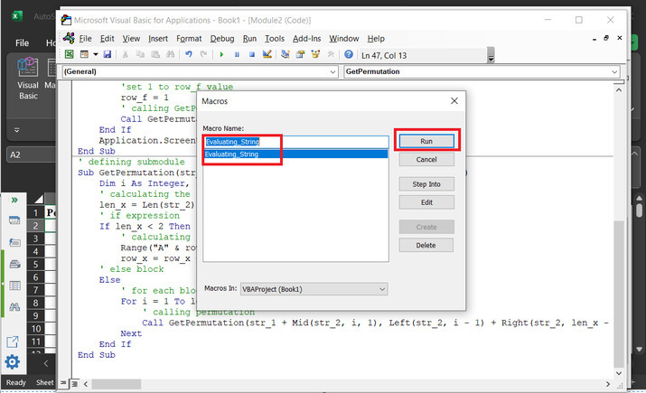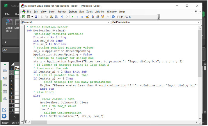 ' define function header Sub Evaluating_String() 'Declaring required variables Dim str_x As String Dim row_f As Long Dim sc_x As Boolean ' setting required parameter values sc_x = Application.ScreenUpdating Application.ScreenUpdating = False ' message to display for dialog box str_x = Application.InputBox("Enter text to permute:", "Input dialog box", , , , , , 2) ' if length of entered string is less than 2 ' then exist the sub If Len(str_x) < 2 Then Exit Sub ' if len is greater than 8, then If Len(str_x) >= 8 Then ' print message for too many premutations MsgBox "Please eneter less than 8 word combination!!!!!", vbInformation, "Input dialog box" Exit Sub ' else block Else 'clear column 1 data ActiveSheet.Columns(1).Clear 'set 1 to row_f value row_f = 1 ' calling GetPermutation Call GetPermutation("", str_x, row_f) End If Application.ScreenUpdating = sc_x End Sub ' defining submodule Sub GetPermutation(str_1 As String, str_2 As String, ByRef row_x As Long) Dim i As Integer, len_x As Integer ' calculating the required length len_x = Len(str_2) ' if expression If len_x < 2 Then ' calculating range data Range("A" & row_x) = str_1 & str_2 row_x = row_x + 1 ' else block Else ' for each block For i = 1 To len_x ' calling permutation Call GetPermutation(str_1 + Mid(str_2, i, 1), Left(str_2, i - 1) + Right(str_2, len_x - i), row_x) Next End If End Sub