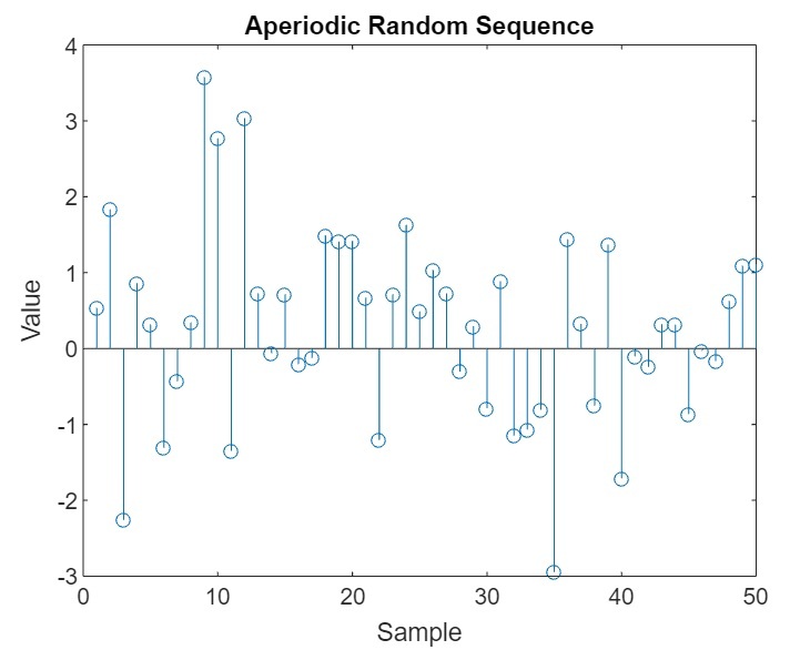 如上所述,非週期性序列是指在一定間隔內沒有規律或可預測模式重複自身的序列。在 MATLAB 中,我們可以透過指定序列的值或使用隨機數生成器(即“randn”)來生成非週期性序列。