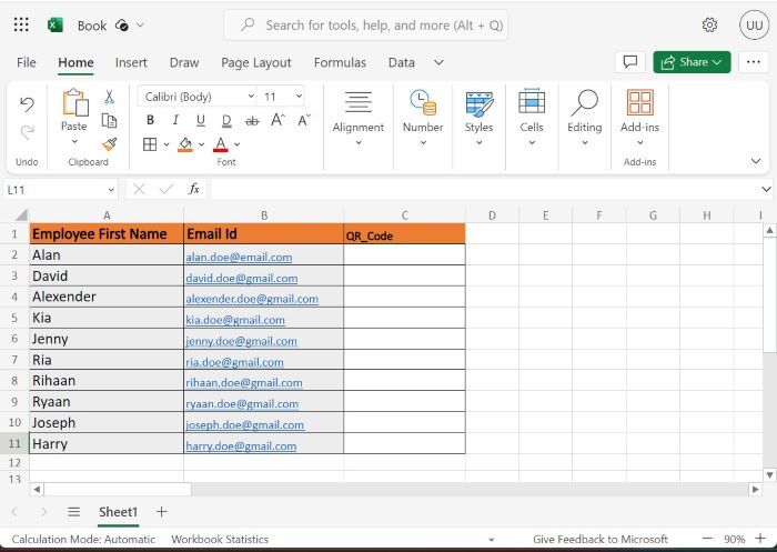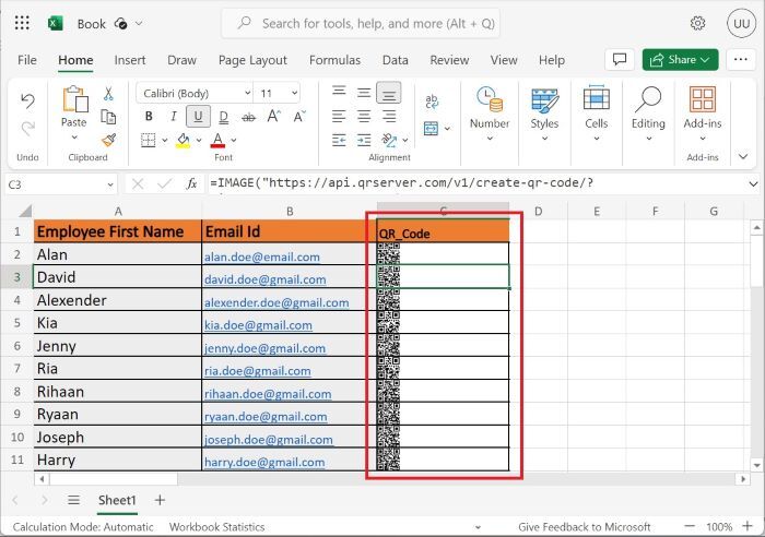 因此,二維碼將顯示在C列中,如下面的影像所示: