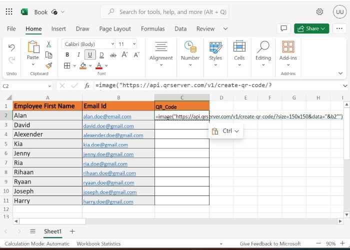 在C2單元格中輸入公式=IMAGE("https://api.qrserver.com/v1/create-qr-code/?size=150x150&data="&B2&"") 並按"Enter"鍵。