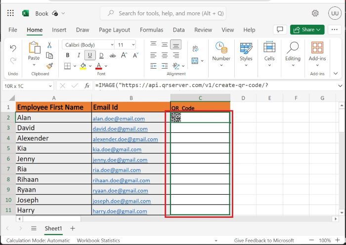 我們可以得出結論,由於IMAGE函式,在單元格中很容易開發二維碼。請確保使用者已獲得源網站的正確URL路徑,該網站用於訪問IMAGE函式中嵌入的二維碼。