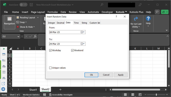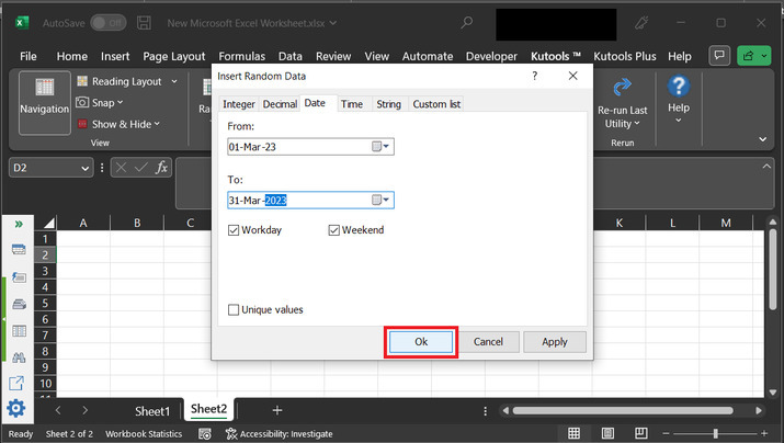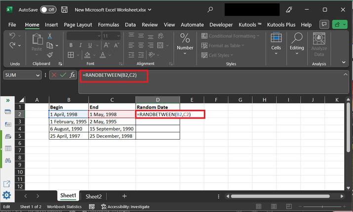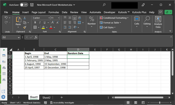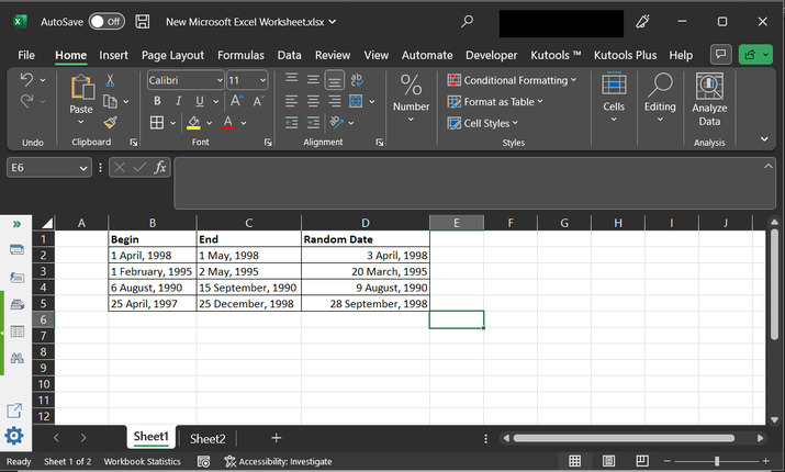 第一種方法基於使用現有函式,第二種策略允許使用者使用 Kutools 擴充套件來生成隨機日期。