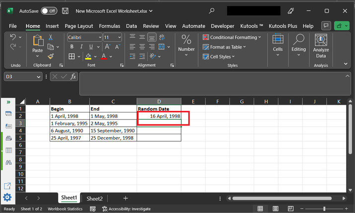 輸入公式後,按“Enter”鍵。這將在提供的日期範圍內列印一個隨機日期。請參考下圖以瞭解生成的結果。