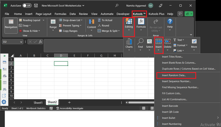 要生成隨機日期,請轉到 **Kutools** 選項卡並選擇“編輯”選項。在“**編輯**”選項中,單擊“**插入隨機資料**”。