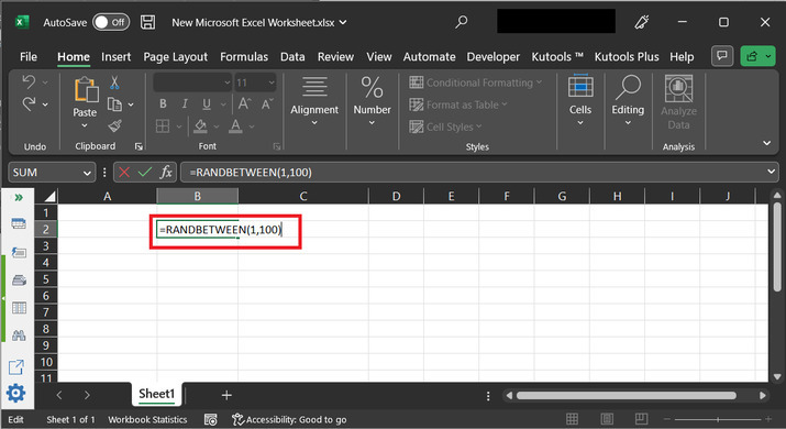 對於此示例,假設使用者希望在 1 到 100 的範圍內生成一個隨機正數。為此,只需鍵入公式“=RANDBETWEEN(1,100)”。