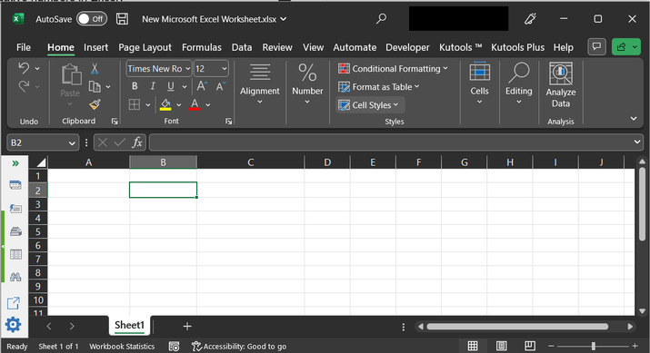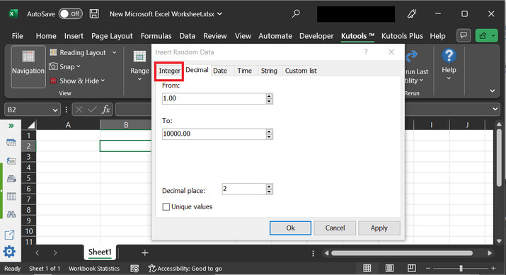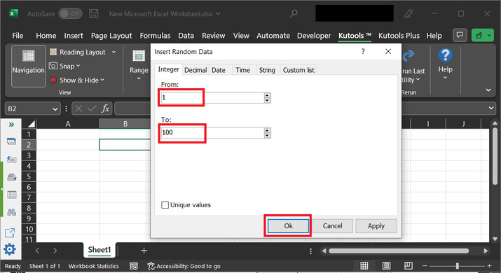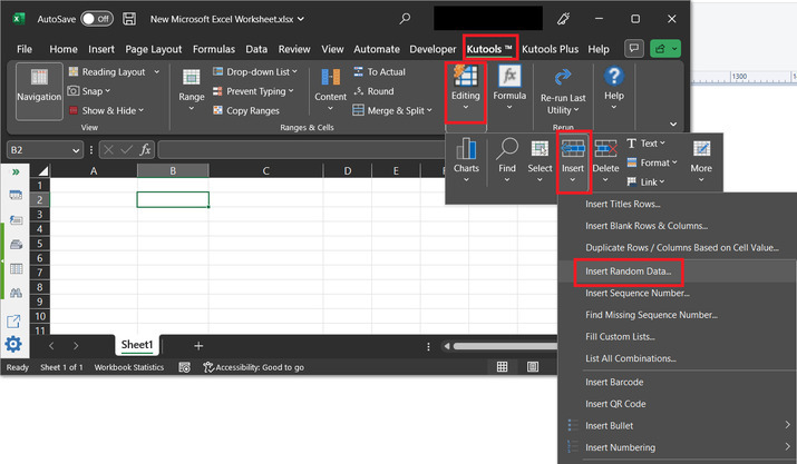 為了理解生成隨機數的過程,讓我們考慮一個空的 Excel 表格,其中 B2 單元格處於活動狀態,並轉到 kutool 選項卡並選擇“插入隨機資料”選項。