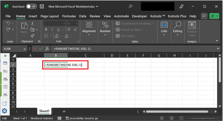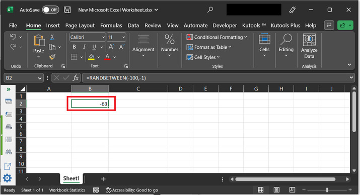 本文允許使用者瞭解生成隨機正數和負數的過程。前兩個示例涉及使用 RANDOM() 方法建立隨機正數和負數,而第三和第四個示例使用“Kutool”生成相同的數字。