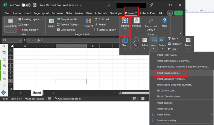 首先,轉到“Kutools”選項卡,然後選擇“編輯”選項。之後選擇“插入”選項,並選擇“插入隨機資料”選項。請參考下圖中突出顯示的因素,以仔細瞭解所有需要選擇的操作。