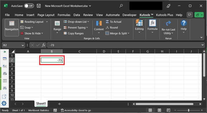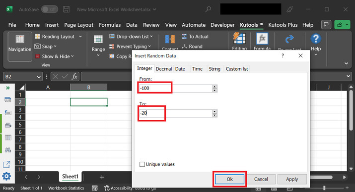 示例 4:使用 kutool 在 Excel 中生成隨機負數