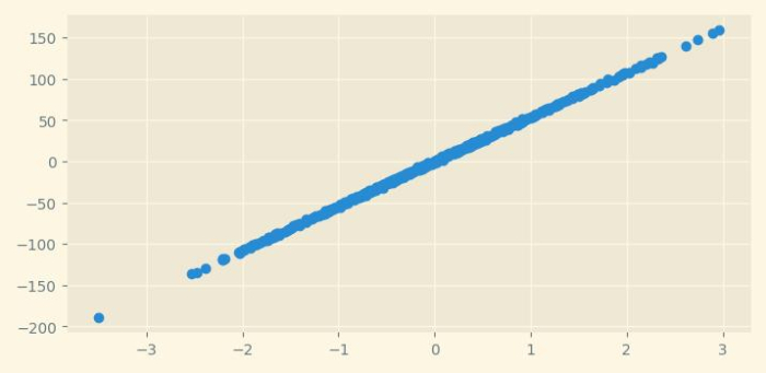 # Importing libraries from sklearn.datasets import make_regression from matplotlib import pyplot as plt from matplotlib import style import seaborn as sns # Set the figure size plt.rcParams["figure.figsize"] = [7.50, 3.50] plt.rcParams["figure.autolayout"] = True # Creating and plotting the regression problem style.use("Solarize_Light2") r_data, r_values = make_regression(n_samples=500, n_features=1, n_informative=2, noise=1) plt.scatter(r_data[:,0],r_values,cmap='rocket'); plt.show()