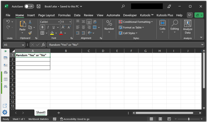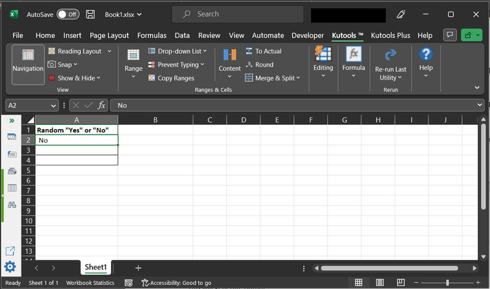 隨機值用於獲取結果。這些結果可用於執行模擬,以瞭解不同系統元件的模式。當用戶需要大型資料集來評估某些常見特徵時,這非常有用。生成隨機的“是”或“否”對於民意調查或意見相關的服務非常有用。本文介紹了兩種在Excel中生成隨機“是”或“否”的方法。第一種方法基於使用Excel中提供的預定義公式。另一方面,第二種方法側重於使用Kutools來簡化工作。