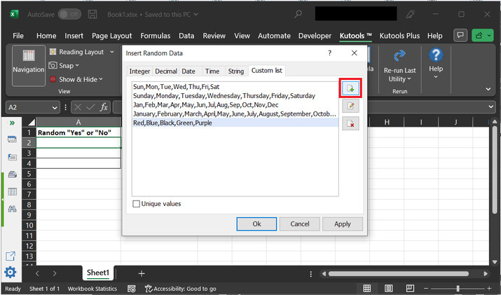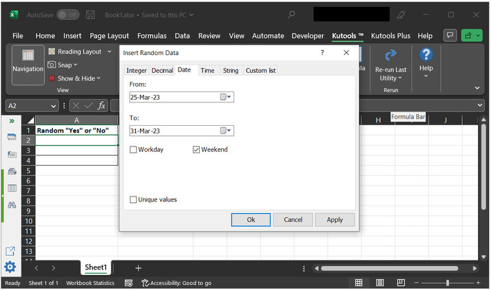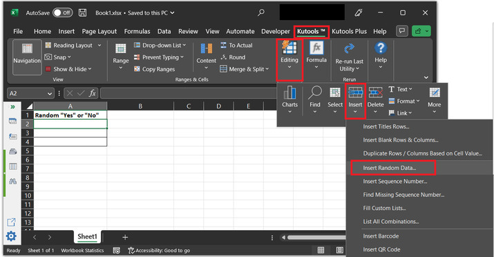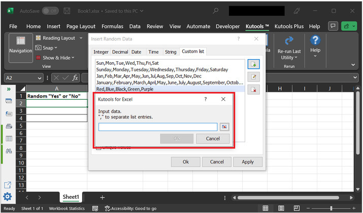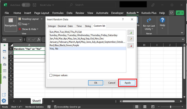 示例2:使用Kutools在Excel中生成隨機的“是”或“否”