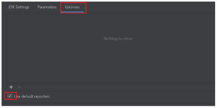在從 IDE 執行 testing.xml 時,使用者必須在“新增配置”->“監聽器”選項卡中啟用預設報告生成。