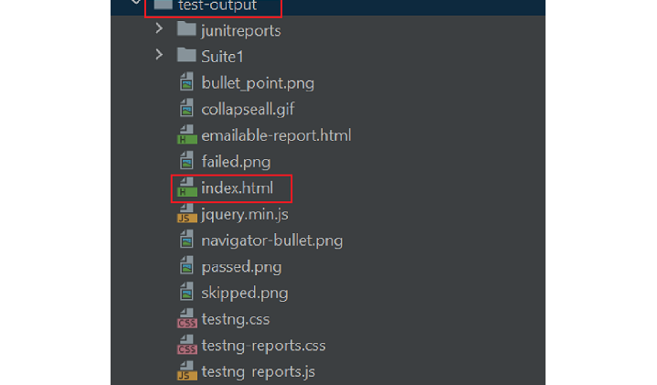 TestNG 允許從 IntelliJ IDE 以及命令列執行測試套件。當用戶從 IDE 或命令列執行 testing.xml 時,TestNG 會生成一個預設報告。它將所有報告和相應的 html 檔案儲存在 Project -> test-output 資料夾中。如果資料夾不存在,TestNG 會建立該資料夾。