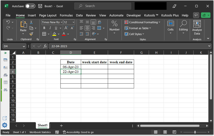 此示例使使用者瞭解用於獲取一週開始日期和結束日期的公式。請考慮以下給定的示例工作表。此工作表包含一個日期列以及用於儲存處理後資料的周開始日期列和週末日期列。