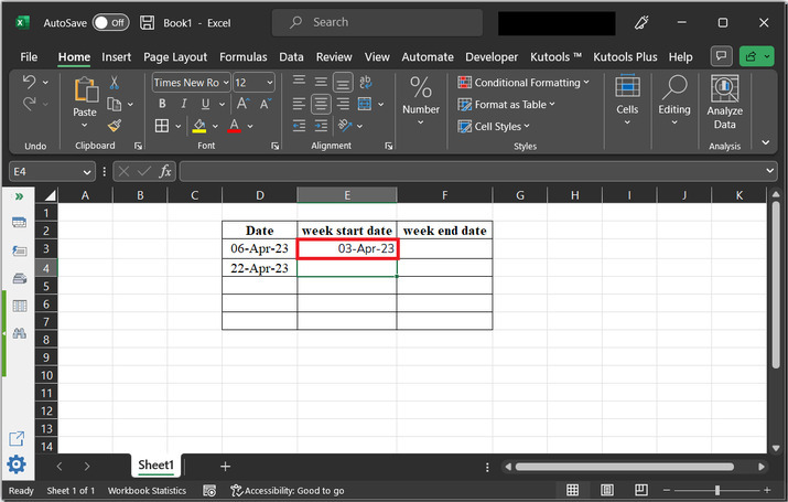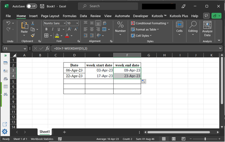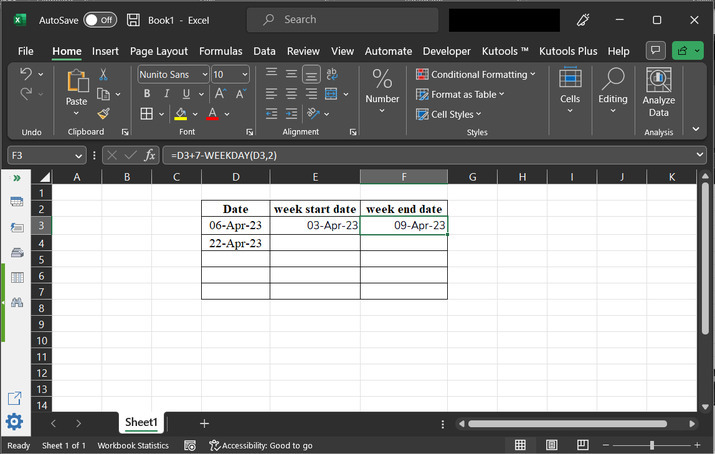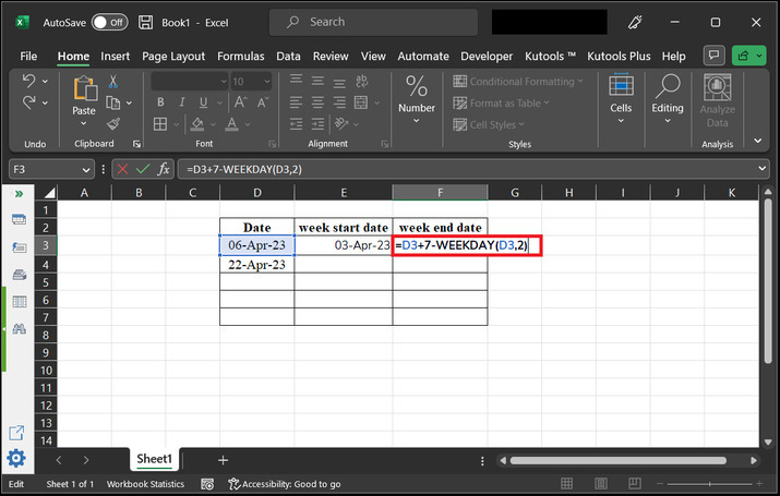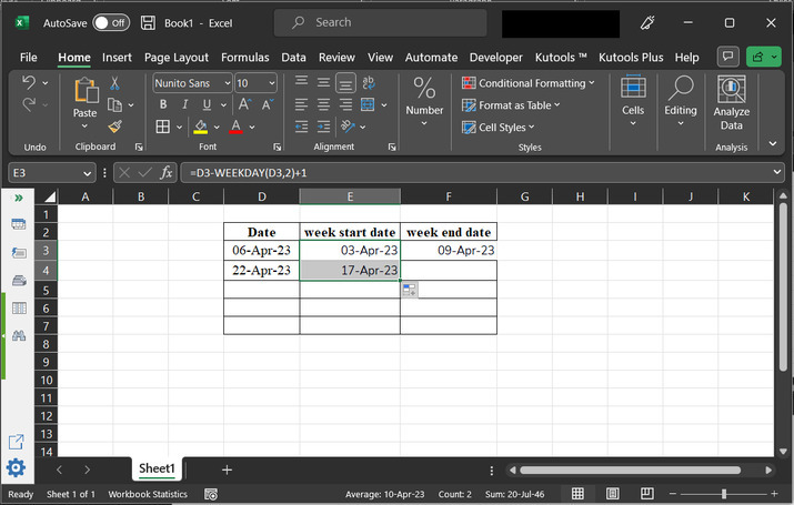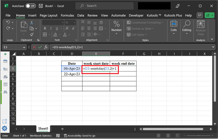 然後,讓我們處理資料以首先獲取周開始日期。然後在單元格中輸入“=D3-WEEKDAY(D3,2)+1”,然後按“Enter”鍵。