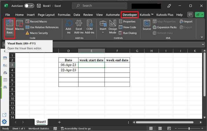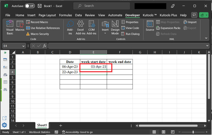 示例 2:使用 VBA 程式碼在 Excel 中根據特定日期獲取一週的開始日期和結束日期