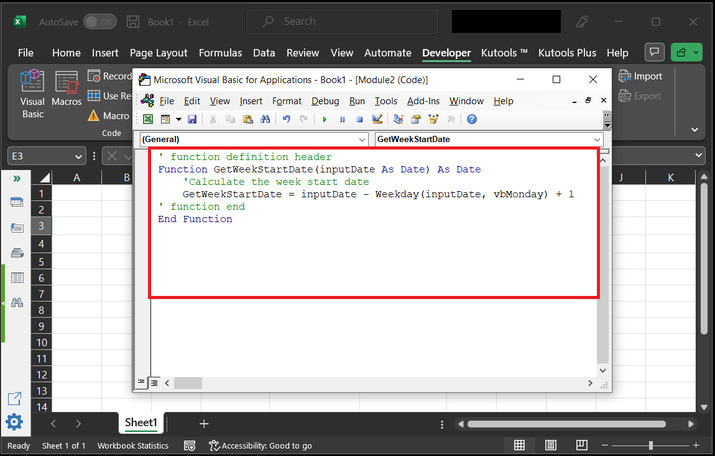 ' function definition header Function GetWeekStartDate(inputDate As Date) As Date 'Calculate the week start date GetWeekStartDate = inputDate - Weekday(inputDate, vbMonday) + 1 ' function end End Function