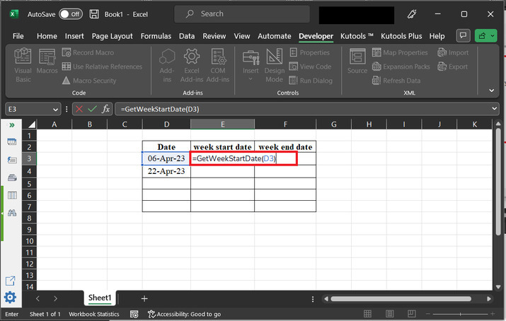 再次開啟 E3 單元格,並生成函式呼叫“=GetWeekStartDate(D3)”。