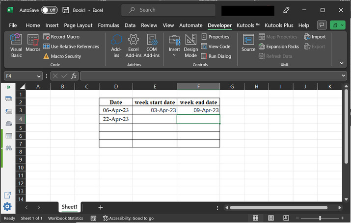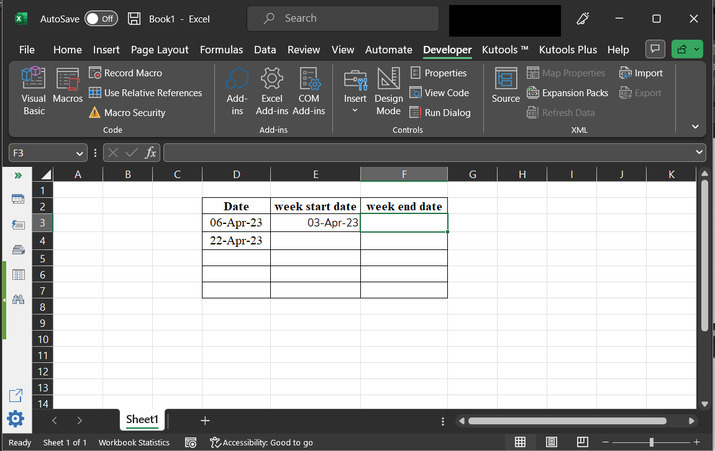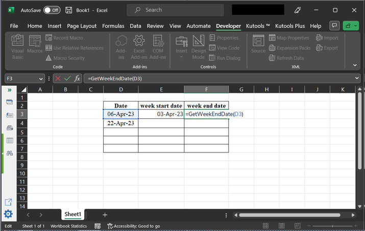 然後轉到 F3 單元格“=GetWeekEndDate(D3)”。這將生成對上述宣告方法的函式呼叫。