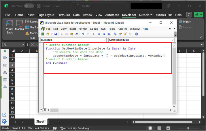 ' define function header Function GetWeekEndDate(inputDate As Date) As Date 'Calculate the week end date GetWeekEndDate = inputDate + (7 - Weekday(inputDate, vbMonday)) ' end of function header End Function