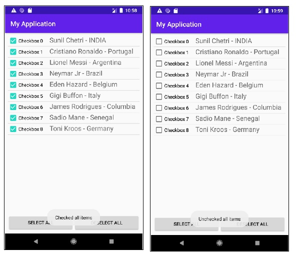 <?xml version="1.0" encoding="utf-8"?> <LinearLayout xmlns:android="http://schemas.android.com/apk/res/android" xmlns:tools="http://schemas.android.com/tools" android:layout_width="match_parent" android:layout_height="match_parent" android:orientation="vertical" android:padding="16dp" tools:context="MainActivity"> <ListView android:id="@+id/listView" android:layout_width="match_parent" android:layout_height="match_parent" android:layout_weight="1"> </ListView> <LinearLayout android:layout_width="match_parent" android:layout_height="50dp" android:orientation="horizontal"> <Button android:id="@+id/select" android:layout_width="match_parent" android:layout_height="wrap_content" android:layout_gravity="center" android:layout_weight="1" android:text="Select all" /> <Button android:id="@+id/deSelect" android:layout_width="match_parent" android:layout_height="50dp" android:layout_weight="1" android:text="Deselect all" /> <Button android:id="@+id/viewSelected" android:layout_width="match_parent" android:layout_height="50dp" android:layout_weight="1" android:text="Next activity" android:visibility="visible" /> </LinearLayout> </LinearLayout>