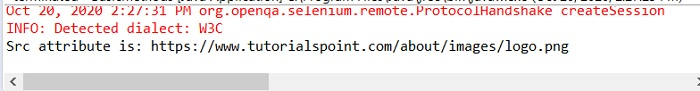 import org.openqa.selenium.By; import org.openqa.selenium.Keys; import org.openqa.selenium.WebDriver; import org.openqa.selenium.WebElement; import org.openqa.selenium.chrome.ChromeDriver; import java.util.concurrent.TimeUnit; public class AttributeVal{ public static void main(String[] args) { System.setProperty("webdriver.chrome.driver", "C:\Users\ghs6kor\Desktop\Java\chromedriver.exe"); WebDriver driver = new ChromeDriver(); //implicit wait driver.manage().timeouts().implicitlyWait(5, TimeUnit.SECONDS); //application launch driver.get("https://tutorialspoint.tw/about/about_careers.htm"); // identify element WebElement l=driver.findElement(By.className("tp-logo")); // getAttribute() to get src value String value = l.getAttribute("src"); System.out.println("Src attribute is: "+ value); //browser close driver.close() } }