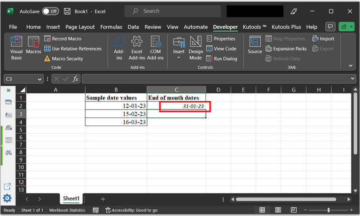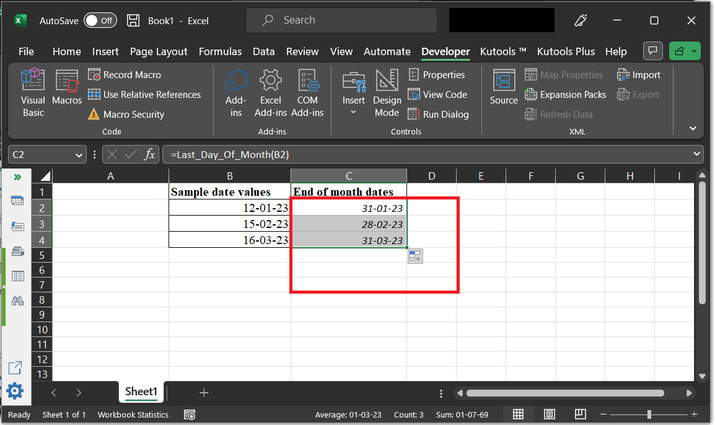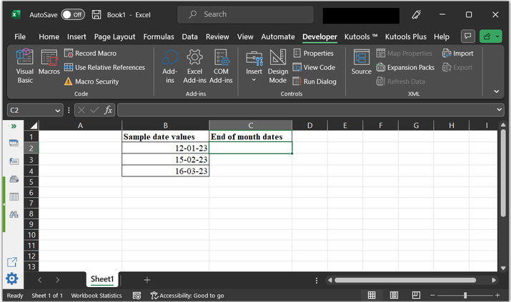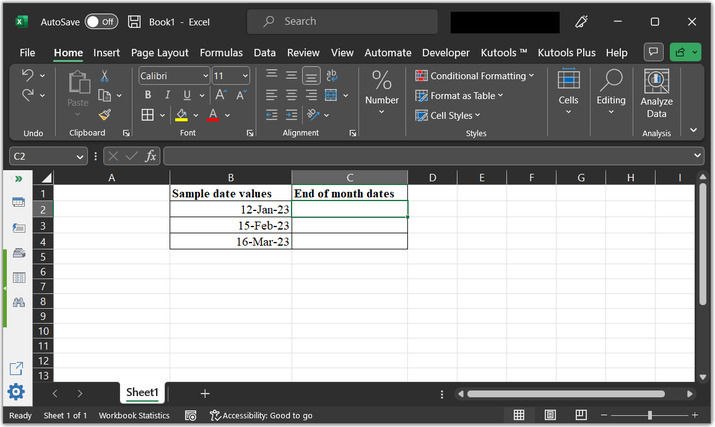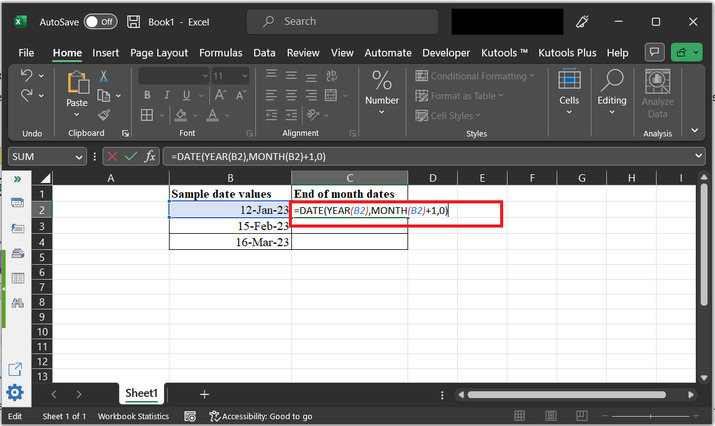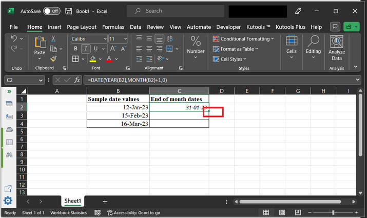 這將在“C2”列中鍵入月份的最後一天。請考慮以下提供的快照