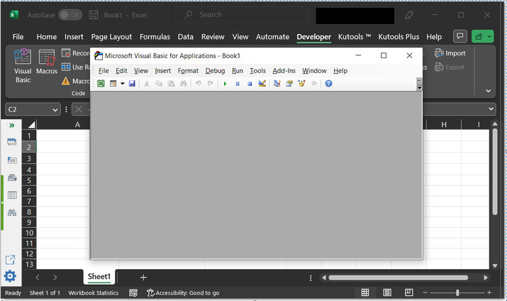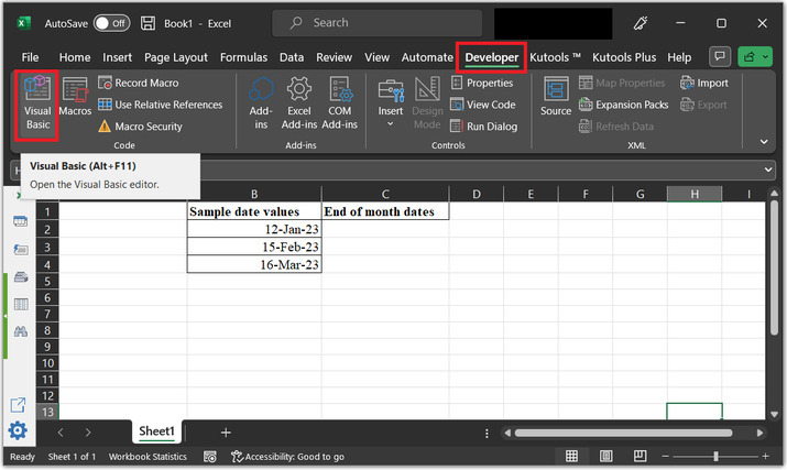 要使用VBA程式碼,使用者需要開啟VBA編輯器。轉到“開發工具”選項卡,然後在“程式碼”部分下,單擊“Visual Basic”選項。請參考以下給出的圖片
