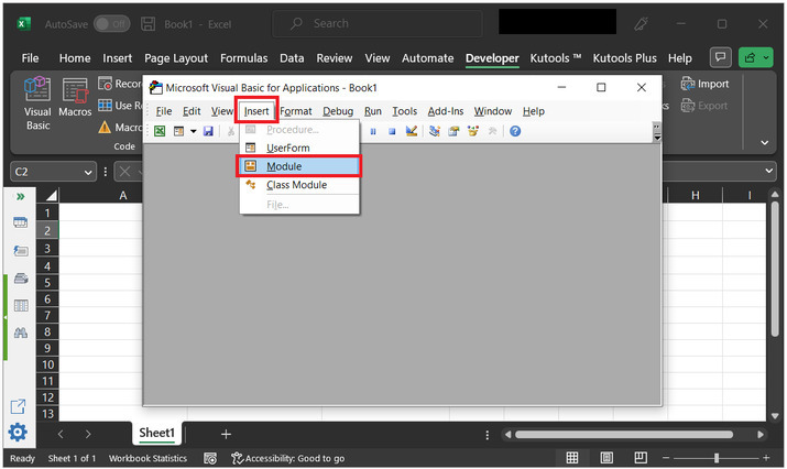 然後在“Microsoft Visual Basic for Applications”對話方塊中。轉到“插入”選項卡,然後選擇“模組”選項。如下所示